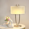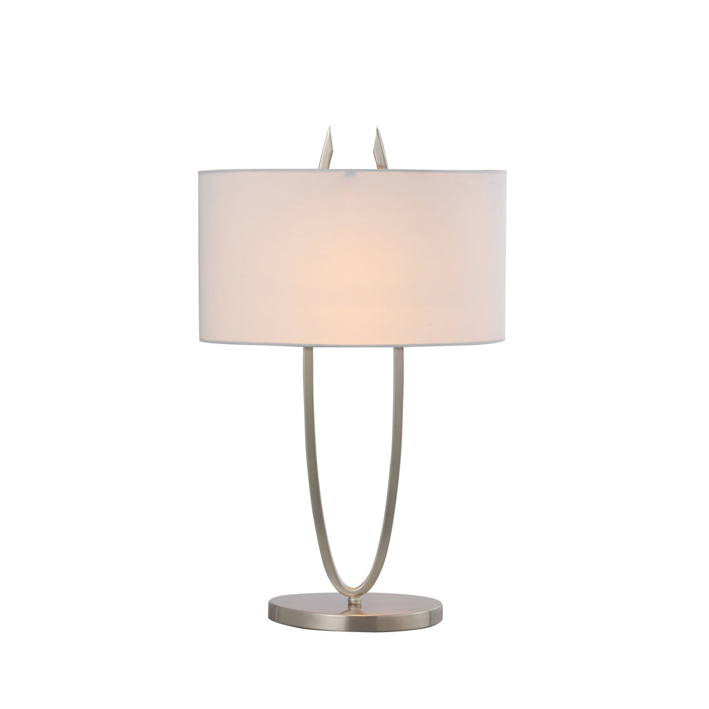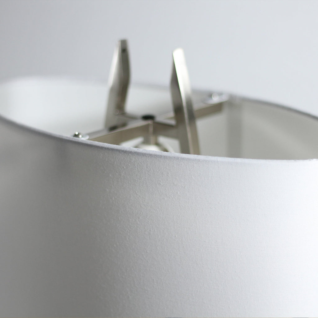 The Denise Table Lamp features an ovoid theme with an elliptic cylinder with a fabric lampshade that offers soft mood lighting from a single globe through the linen while allowing light to run up walls or up to ceilings while highlighting the feature support and base.