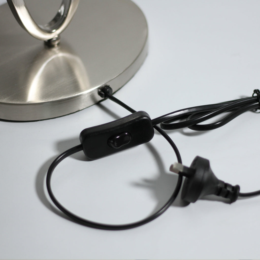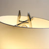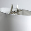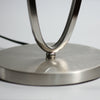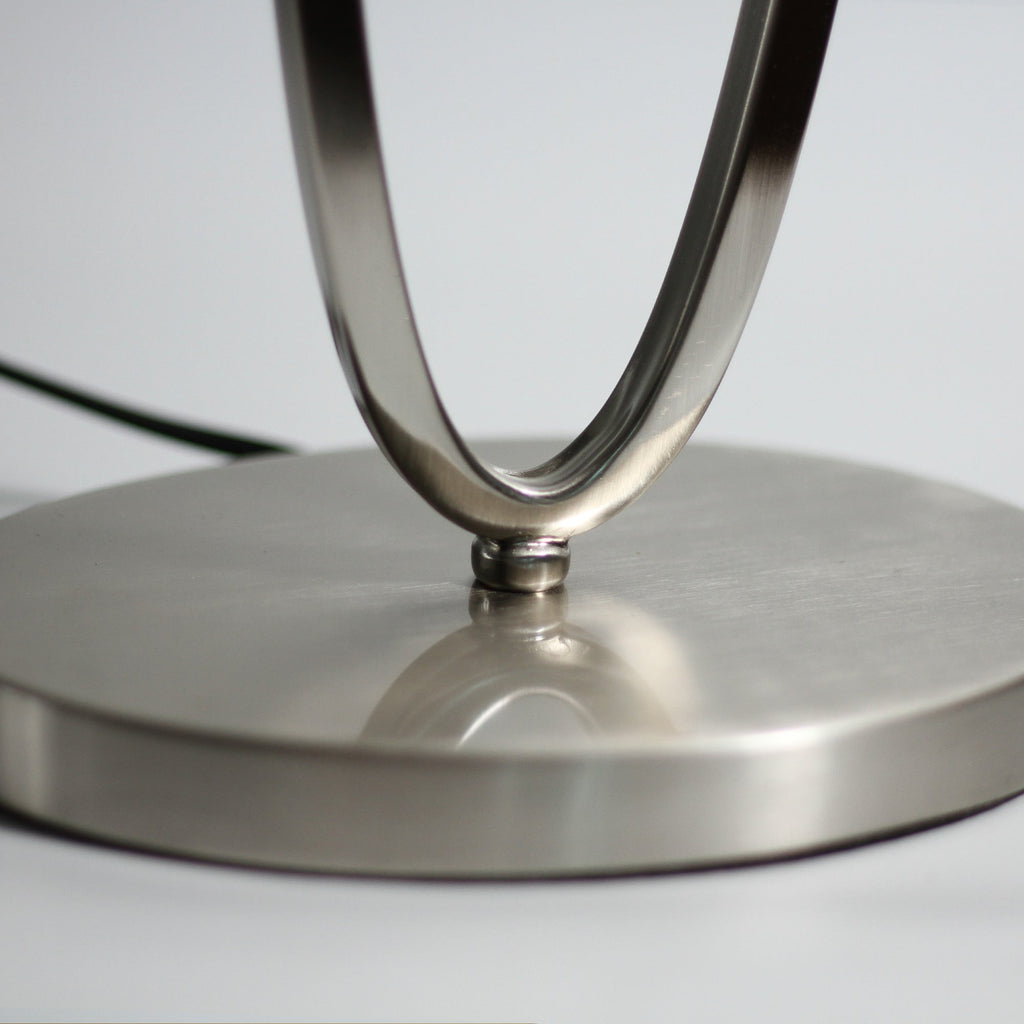 This lamp intelligently uses space as the main feature captured between a slim broken elliptical metallic body conjoined at the base and breaking through at the sharply angled tips just protruding through the lampshade like horns. The base is made of an oval disc that completes the ovoid theme of this stunning lamp. This minimalistic but eye-catching lamp comes in satin chrome with a gold body and base.